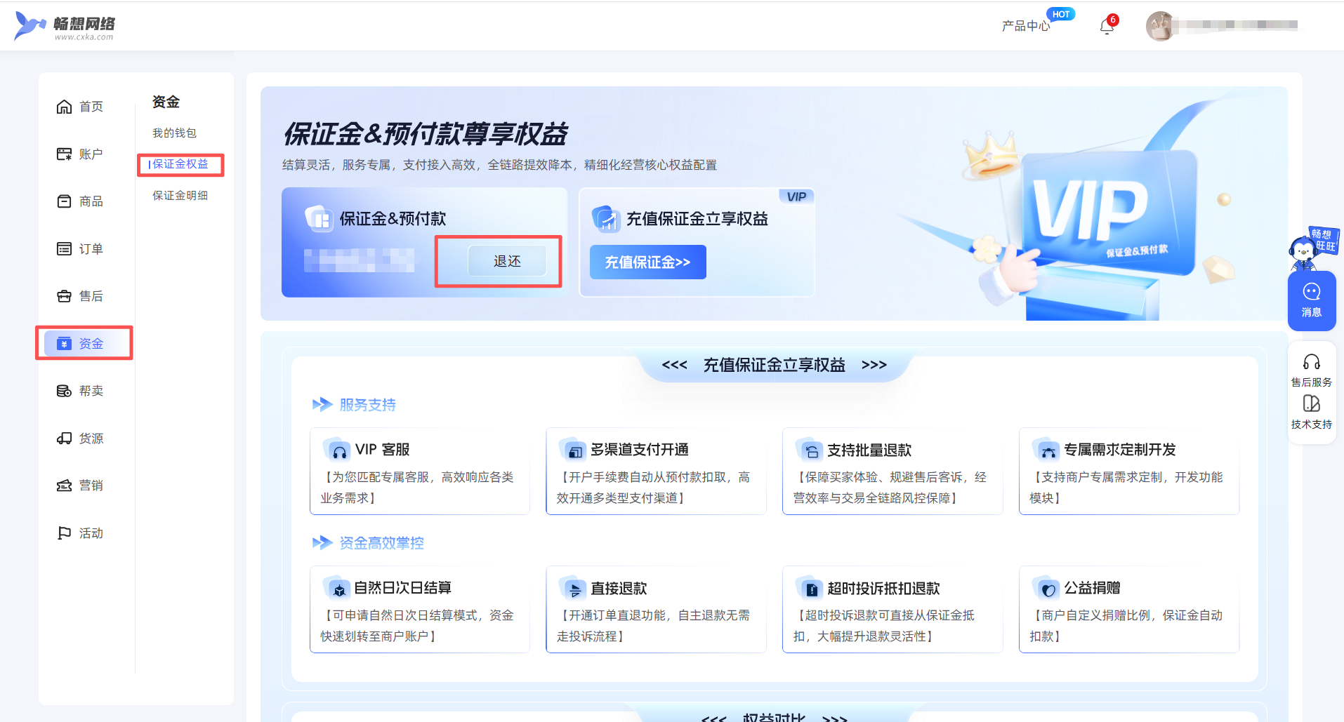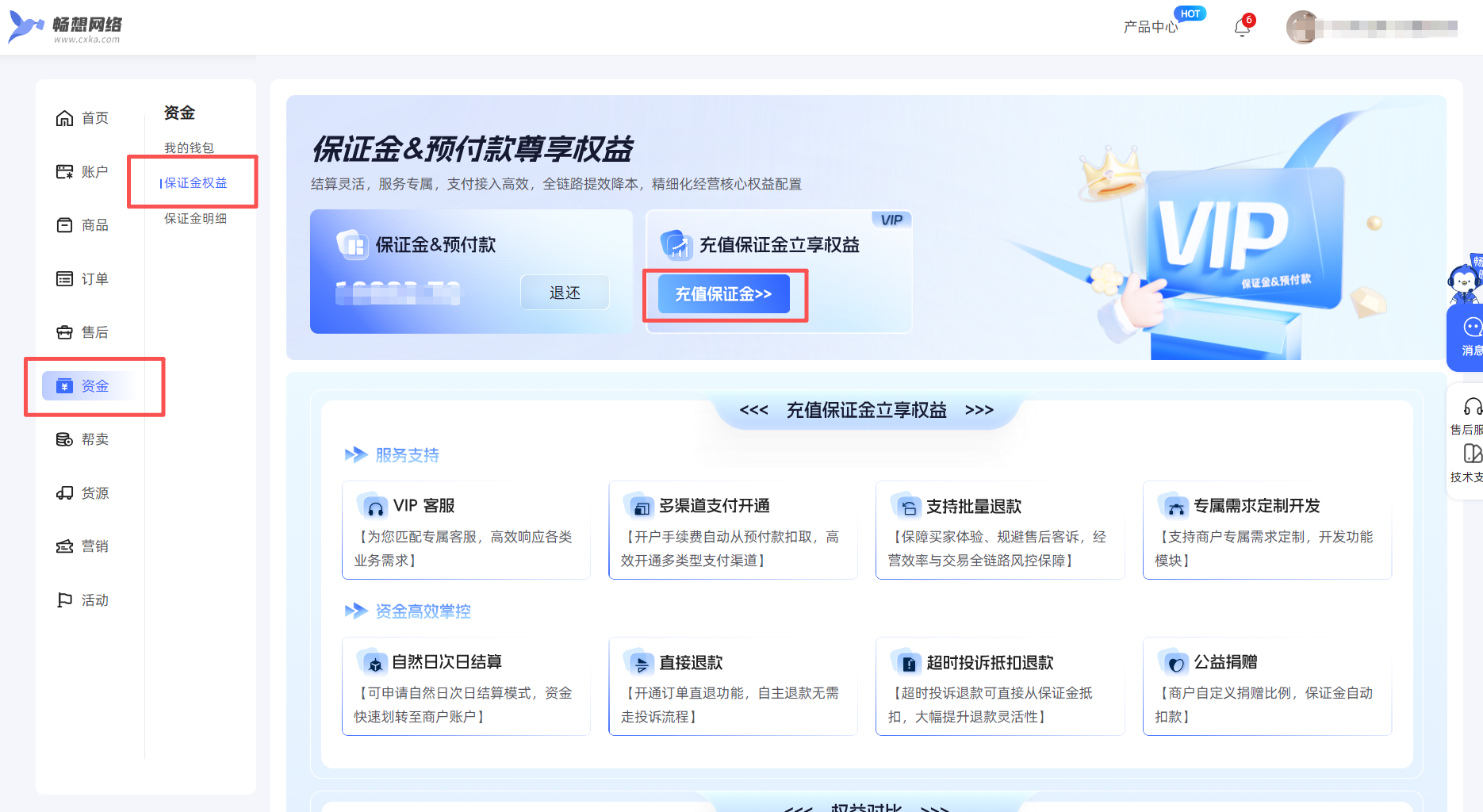 商家中心选择【资金】页面,选择【保证金权益】,点击[充值保证金]即可